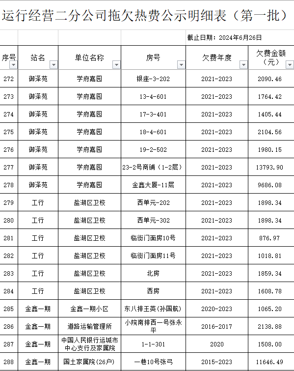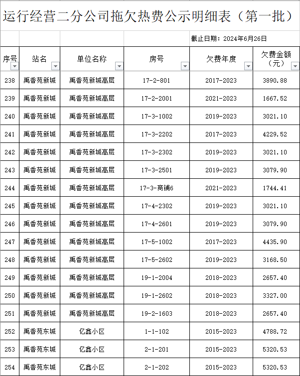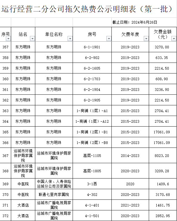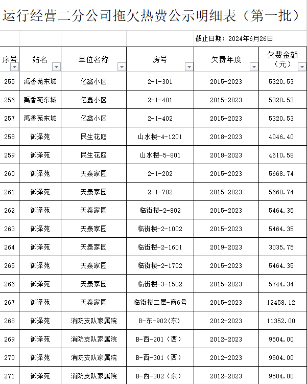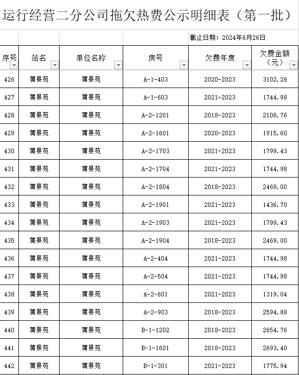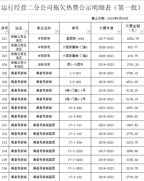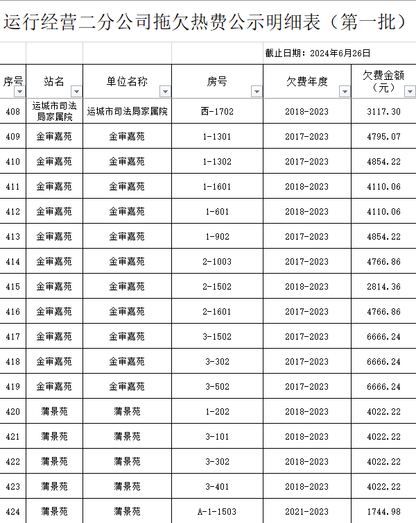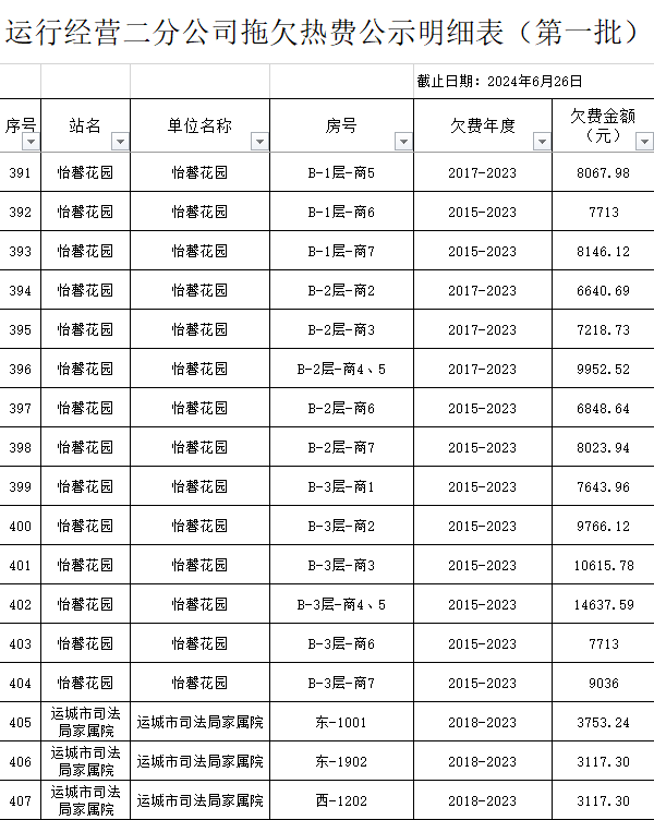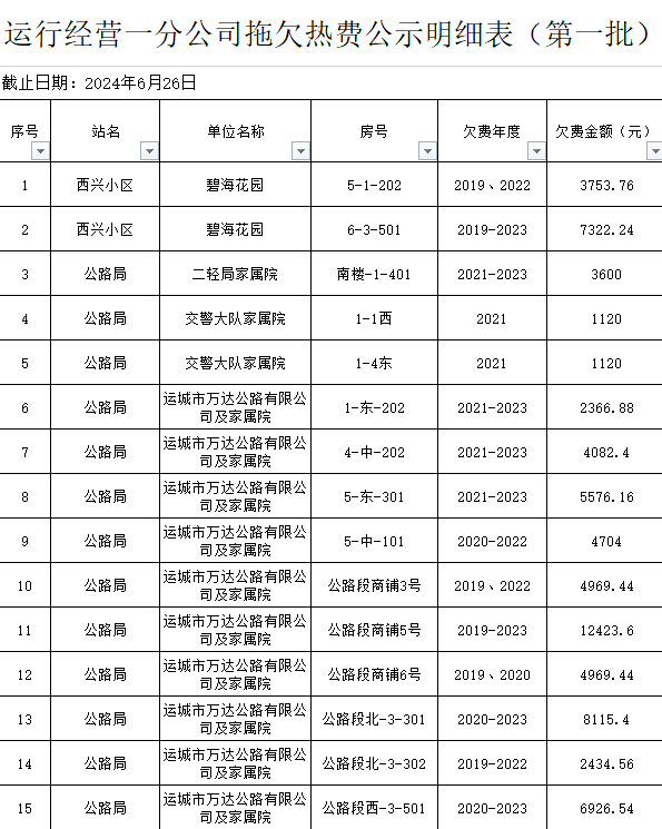 根據(jù)《運(yùn)城市中心城區(qū)集中供熱管理暫行辦法》第二十五條及運(yùn)價(jià)管字【2009】199號(hào)《關(guān)于明確集中供熱收費(fèi)有關(guān)問題的通知》第一項(xiàng)“城市供熱實(shí)行繳費(fèi)用熱的原則”,截至目前,仍有部分用戶未繳納2023年度及以前年度熱費(fèi),直接影響了供熱企業(yè)正常生產(chǎn)運(yùn)行。為了加快欠費(fèi)回籠,確保供熱企業(yè)生產(chǎn)運(yùn)行,請(qǐng)下列欠費(fèi)的用戶,在2024年10月30日之前交清拖欠熱費(fèi)。否則,供熱企業(yè)有權(quán)依法維護(hù)自身權(quán)益,拖欠用戶將承擔(dān)相應(yīng)的責(zé)任和由此造成的一切后果。也通過媒體公示,讓社會(huì)監(jiān)督,讓我們共同行動(dòng),共同營(yíng)造良好供熱運(yùn)營(yíng)環(huán)境和氛圍,為廣大居民溫暖過冬發(fā)揮各自應(yīng)有的作用。