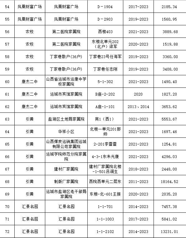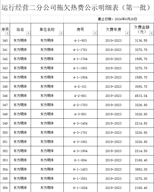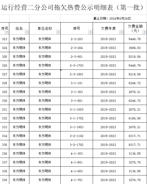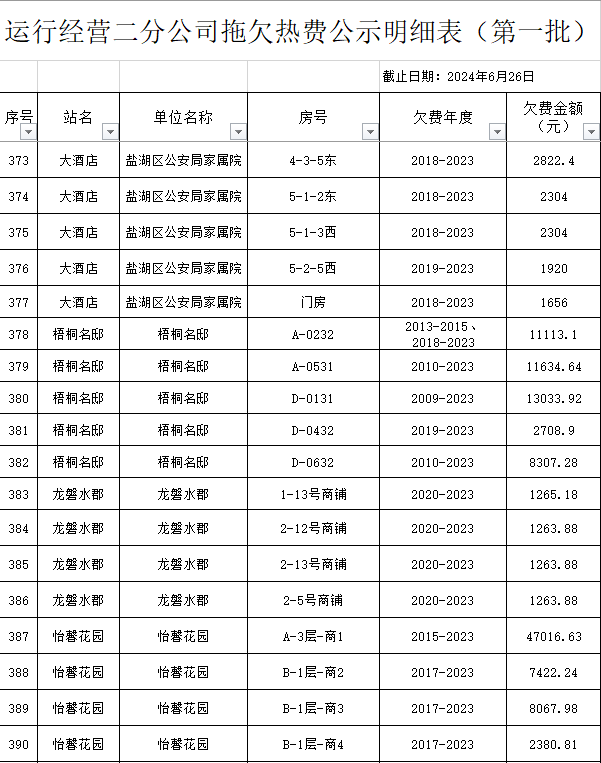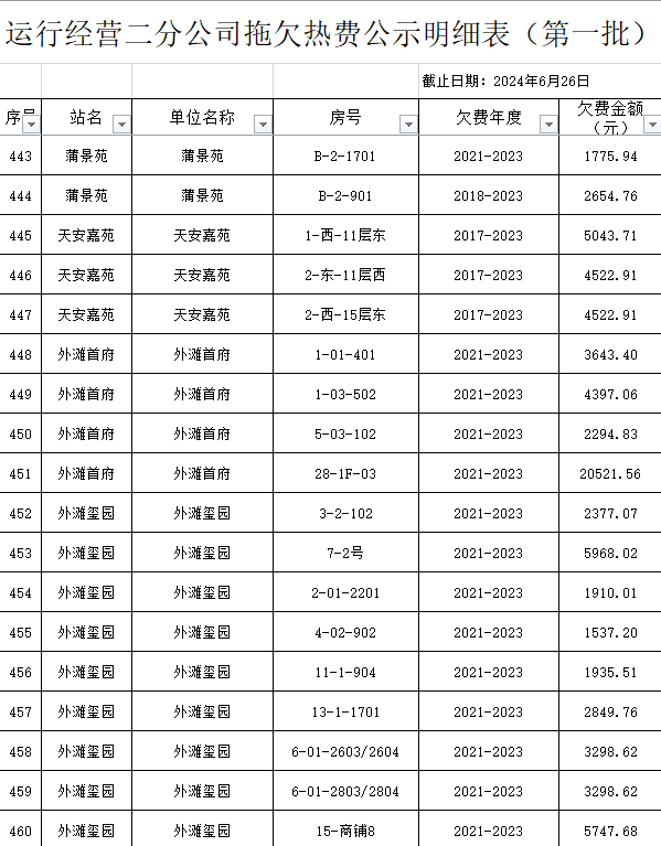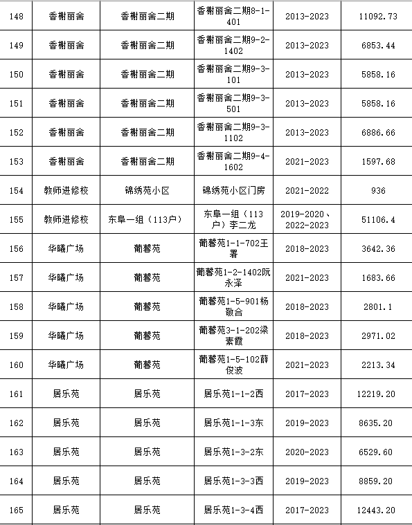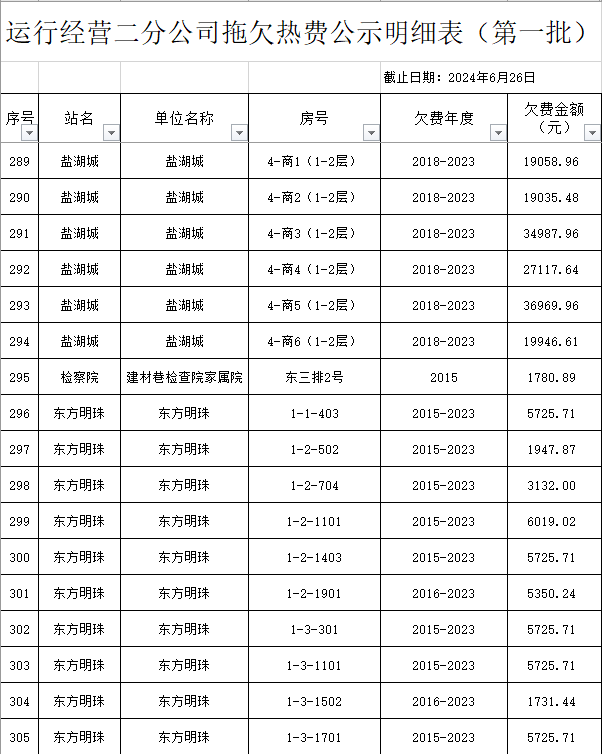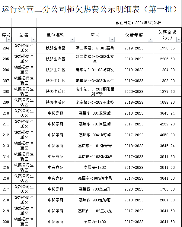 根據(jù)《運(yùn)城市中心城區(qū)集中供熱管理暫行辦法》第二十五條及運(yùn)價(jià)管字【2009】199號(hào)《關(guān)于明確集中供熱收費(fèi)有關(guān)問題的通知》第一項(xiàng)“城市供熱實(shí)行繳費(fèi)用熱的原則”,截至目前,仍有部分用戶未繳納2023年度及以前年度熱費(fèi),直接影響了供熱企業(yè)正常生產(chǎn)運(yùn)行。為了加快欠費(fèi)回籠,確保供熱企業(yè)生產(chǎn)運(yùn)行,請(qǐng)下列欠費(fèi)的用戶,在2024年10月30日之前交清拖欠熱費(fèi)。否則,供熱企業(yè)有權(quán)依法維護(hù)自身權(quán)益,拖欠用戶將承擔(dān)相應(yīng)的責(zé)任和由此造成的一切后果。也通過媒體公示,讓社會(huì)監(jiān)督,讓我們共同行動(dòng),共同營(yíng)造良好供熱運(yùn)營(yíng)環(huán)境和氛圍,為廣大居民溫暖過冬發(fā)揮各自應(yīng)有的作用。